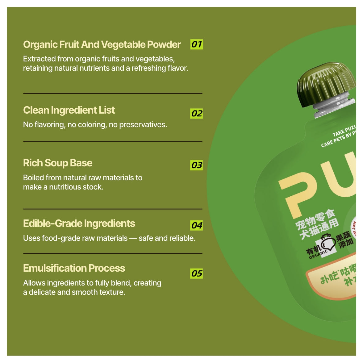 PUZI® /pu-chi/ is an Asian pet food brand dedicated to creating natural, science-based meals for cats and dogs. Each recipe combines real meat, functional ingredients, and nutrient-rich broths ensuring a perfect balance of taste and wellness. Trusted by pet owners across Asia, PUZI® promotes better digestion, stronger immunity, and happier, healthier pets.